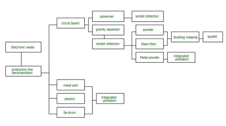 The disposal system of electronic waste sets to physically dissemble all sorts of electronic wastes in order to realize recycling. It is composed of two parts: general disposal line and specific disposal line to exert integrated treatment and recycling of the electronic waste.